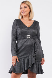 Plus Long Sleeve V-neck Asymmetrical Wrap Flare Hem Belt Detail Oval Rhinestone Buckle Mini Dress