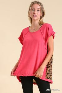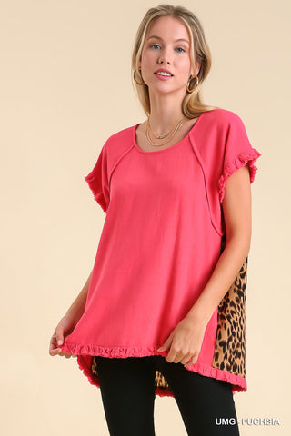 Linen Blend Short Ruffle Sleeve Round Neck Top With Animal Print Scoop Back - S