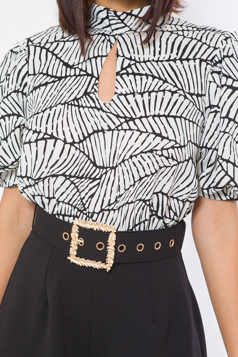Imported S.M.L WOVEN PRINT TOP FASHION ROMPER. KEYHOLE DETAIL, SHORT SLEEVE, AND BELT DETAIL 95% Polyester 5% Spandex White/Black VAL