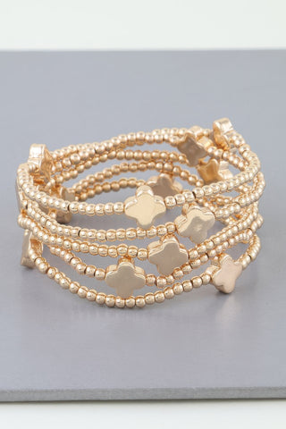Product Description: Add a playful yet polished touch to your accessory collection with the Multi Clover Beaded Bracelet. This stretch bracelet features rows of delicate, gold-toned beads interspersed with charming clover-shaped accents for a whimsical finish. The layered coil design wraps comfortably around the wrist, creating an effortlessly stacked look. Perfect for adding a hint of shine and sophistication, this bracelet transitions seamlessly from casual days to dressed-up evenings. Its versatile styling and radiant finish make it a must-have for any modern jewelry lover.