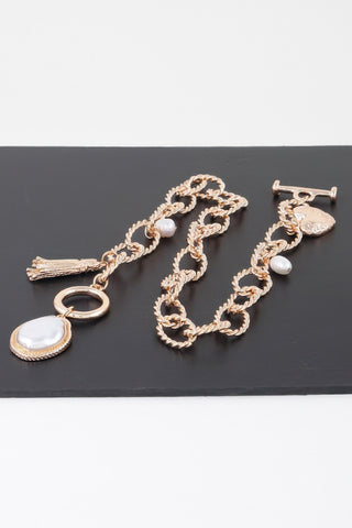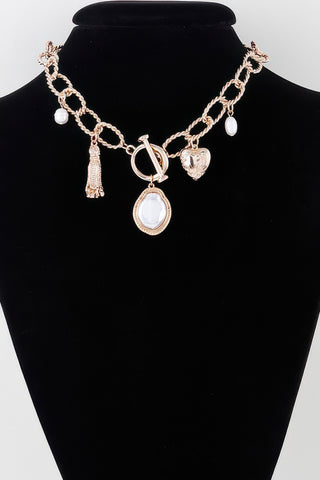 Fabric: The necklace is crafted with a high-quality gold-plated chain, adorned with a mix of luxurious charms in a warm cream tone that catch the light beautifully.