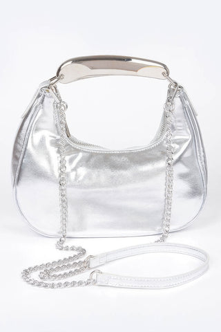 Product Description: Polished and contemporary, the Metallic Faux Leather Metal Top Handle Clutch—also known as the Chic Chain Clutch—offers a sleek fusion of elegance and edge. Crafted from high-quality polyurethane with a metallic finish, this clutch features structured lines, bold metal hardware, and a statement top handle. A detachable chain strap provides styling versatility, allowing it to be worn crossbody or carried by hand. Spacious enough for your essentials, it’s the ideal accessory for evening events, parties, or elevating your day-to-night look.