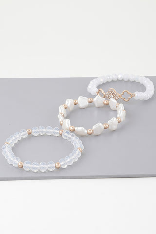 Product Description: Brighten your wrist with the Multi Clover Crystal Bead Bracelet, a beautifully coordinated trio designed to bring elegance and charm to any ensemble. This stunning set features luminous white beads paired with shimmering multi-clover crystal accents, creating a harmonious blend of sparkle and sophistication. Measuring approximately 2.4 x 2.4 inches, the stretch design ensures a comfortable fit while offering effortless styling versatility. Whether worn as a full stack or individually, these bracelets add a polished touch to both casual and dressy looks. A must-have for any jewelry lover, this set delivers timeless appeal with a modern edge.