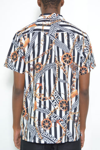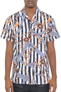 - Design: This shirt features a unique gold chain status print for a luxurious, eye-catching look. The button-down closure and collared design provide a sharp, refined appearance
