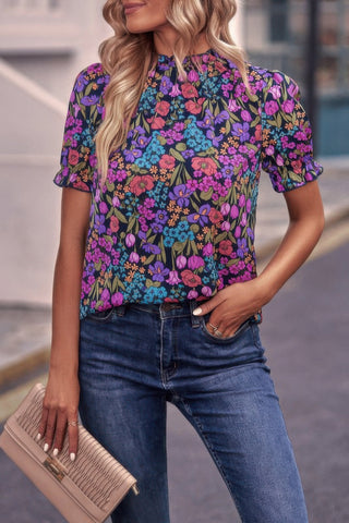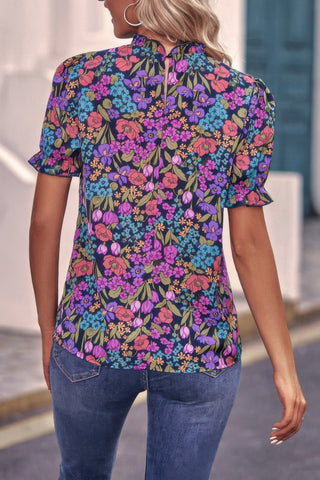 Allover Floral Puff Sleeve Frill Neck Blouse