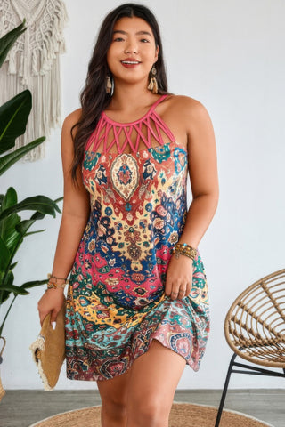 Product Description: Channel effortless summer vibes with this plus-size boho halterneck dress, designed with intricate hollow-out detailing and a breezy sleeveless cut. The halterneck neckline adds a touch of elegance while showcasing the shoulders, making it ideal for warm-weather styling. Crafted from a soft, stretchy blend of polyester and elastane, it offers both comfort and a flattering fit. The bohemian-inspired design is perfect for vacation days, outdoor gatherings, or casual outings. Light, stylish, and easy to wear, this dress is your go-to for laid-back chic.
