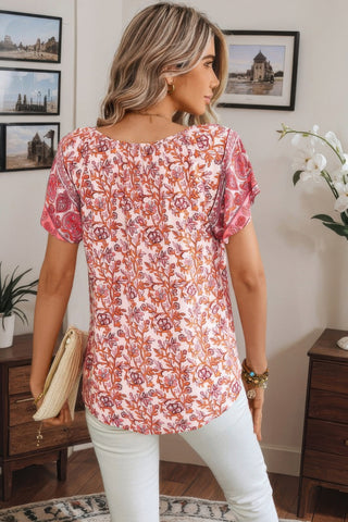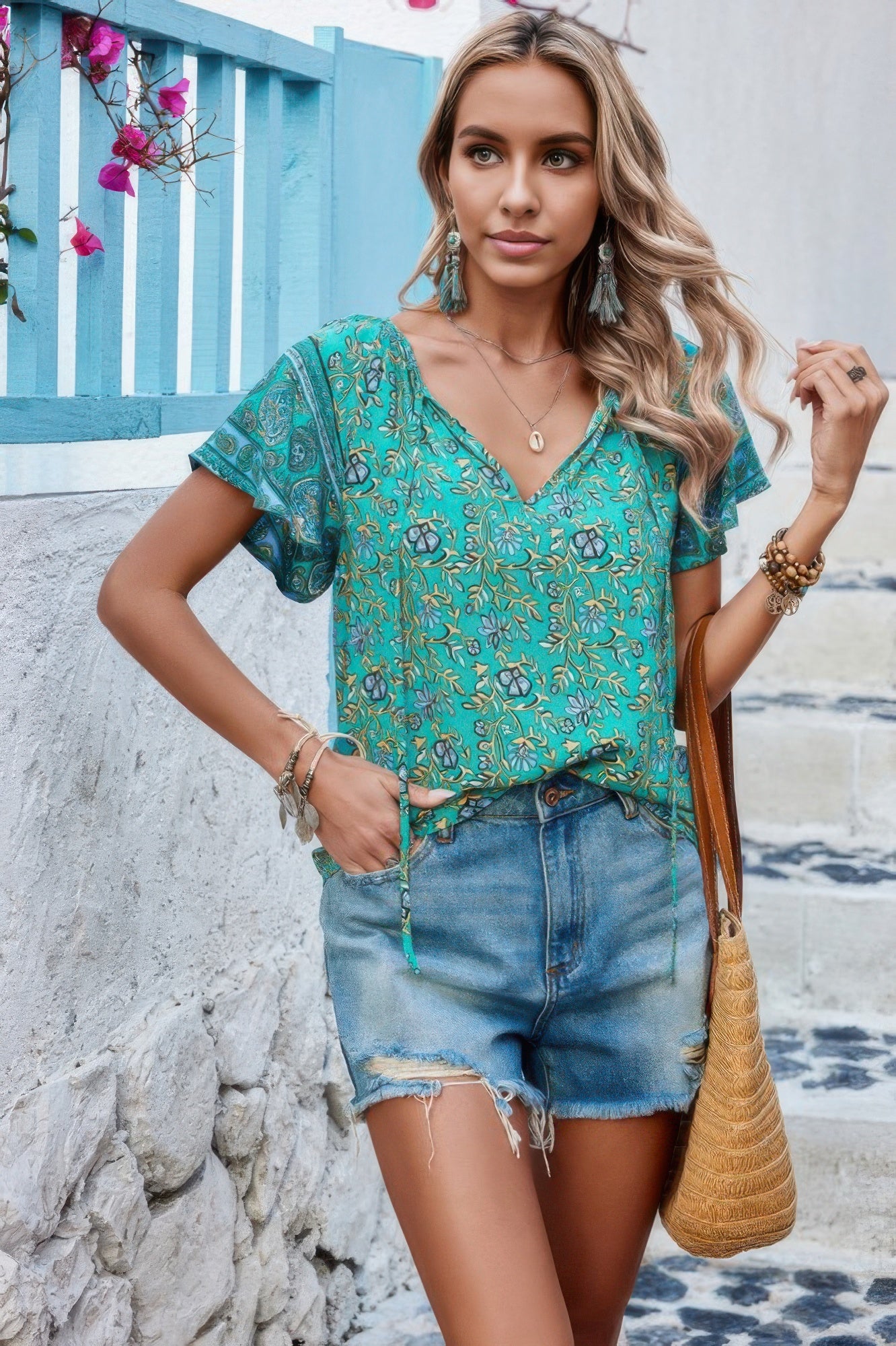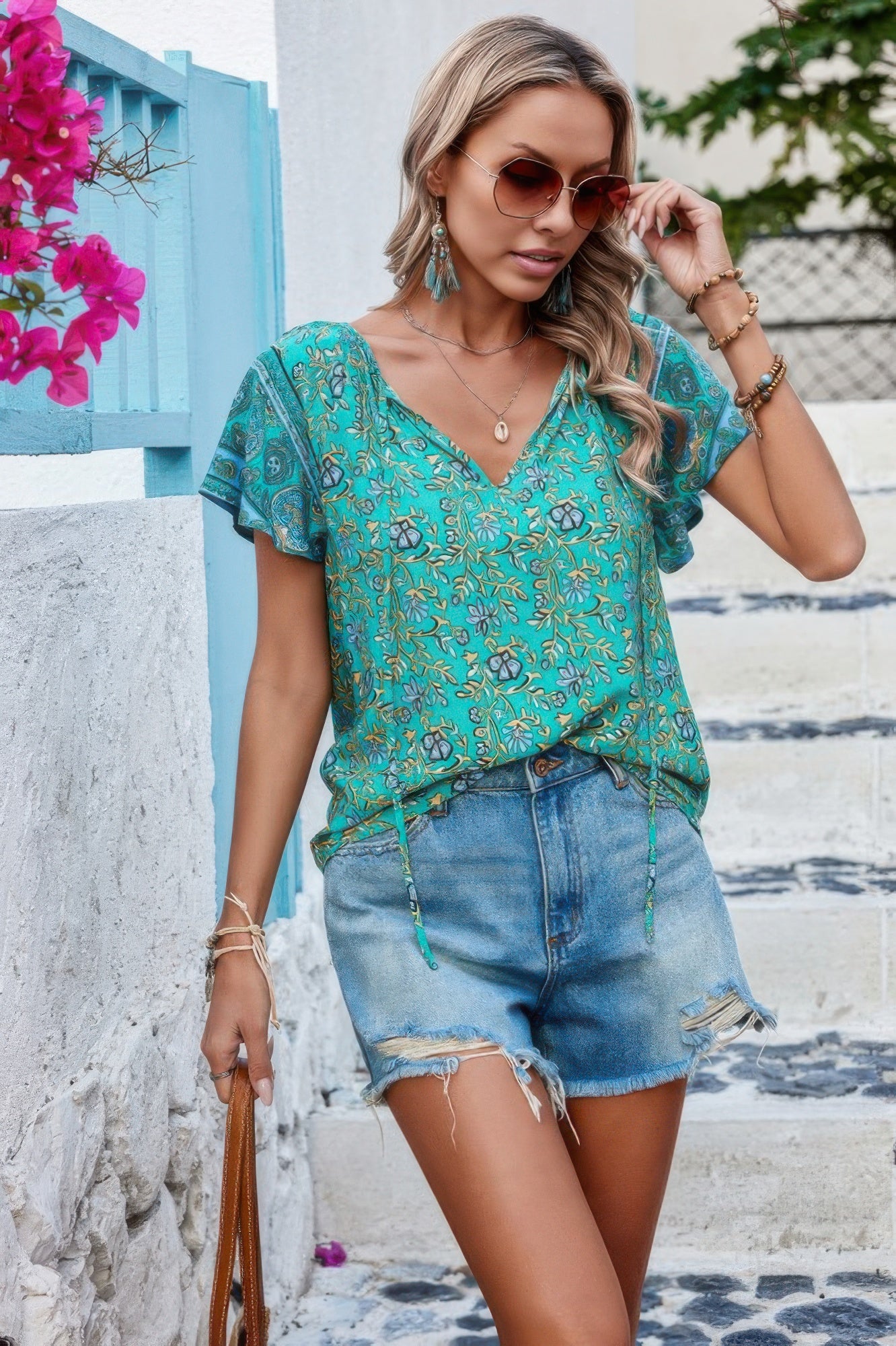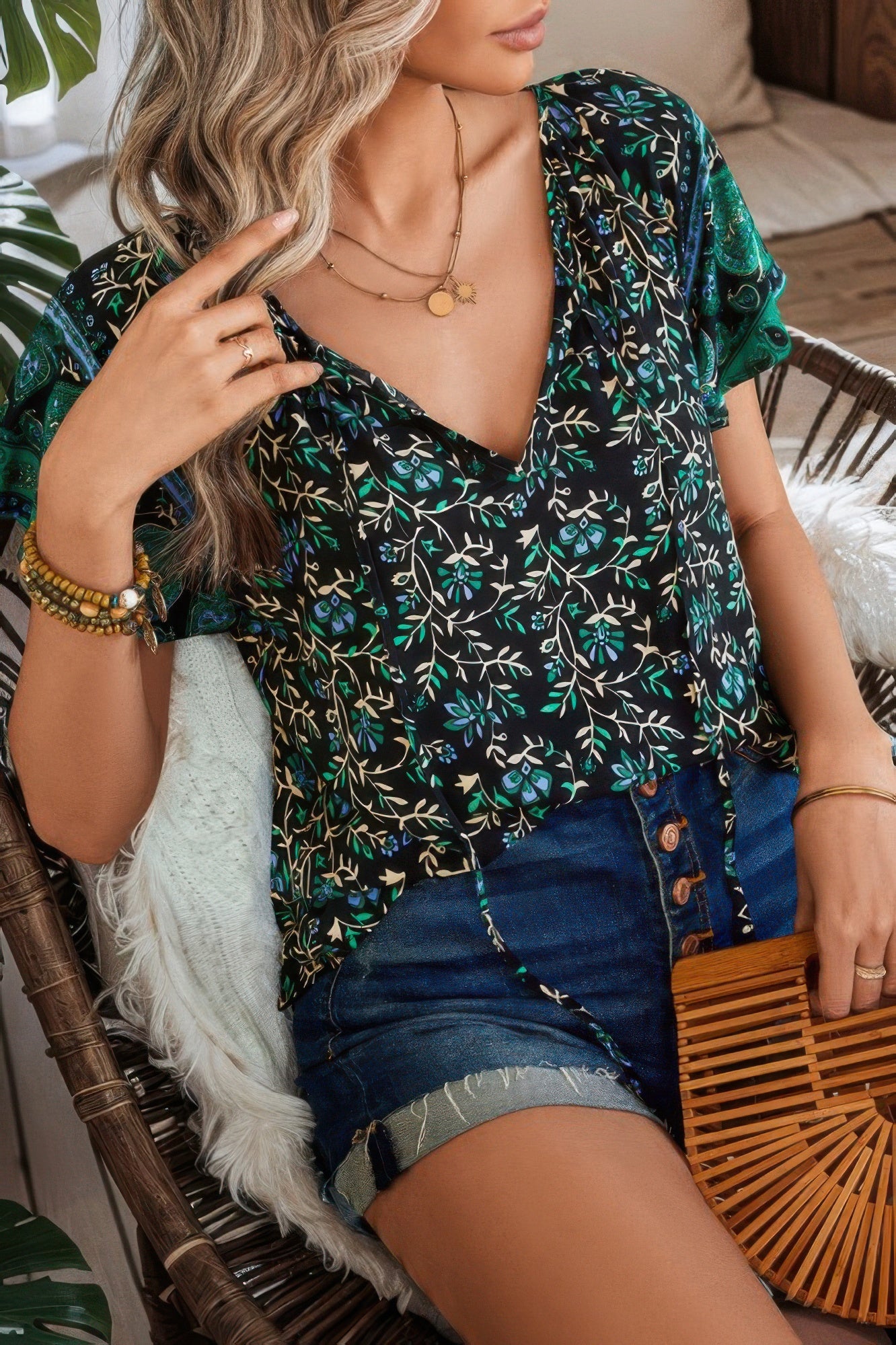 Boho Floral Print V Neck Patchwork Short Sleeve Top