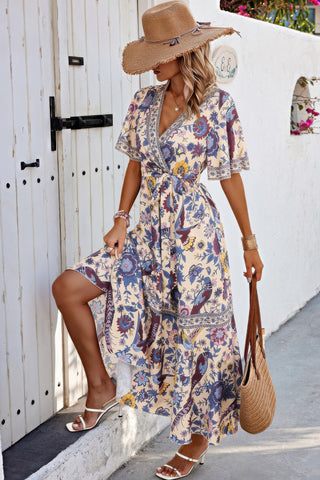 Floral Print Lace Trim Cross Belt A Line Dress Sale